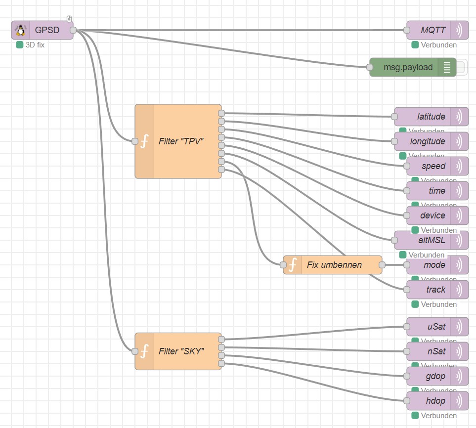 Für Node-Red gibt es die Erweiterung node-red-contrib-gpsd, die als Konfiguration nur die Adresse des Dämons benötigt. Da Node-Red bei mir unter Docker läuft, ist dies nicht localhost, sondern das Gateway des Docker-Subnetzes. Normalerweise ist gpsd so konfiguriert, das es nur unter localhost angesprochen werden kann. Unter Systemd-Troubleshooting ist erläutert, wie das zu ändern ist. Mit einem “function-node” kann man jetzt die unterschiedlichen Daten in eine Variable ablegen und über die verschiedenen Ausgänge geht es dann zu den MQTT-out Nodes, bei denen dann nur noch das passende Topic zu wählen ist. Die Geschwindigkeit wir als Kilometer/h umgerechnet und gerundet und “mode” in ein leichter lesbares Format gewandelt.