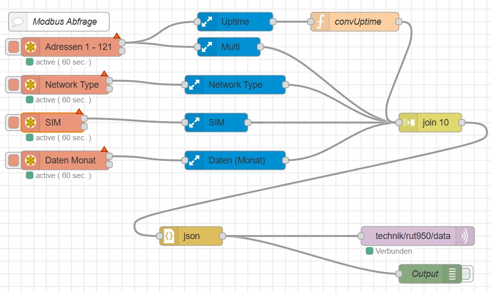 Ich hatte ja schon mal beschrieben, wie man die Daten des LTE-Routers nach HomeAssistant bekommt. Eigentlich war ja das Ziel, die Daten zuerst über MQTT zu lesen und dann in HA anzuzeigen. Mit Node-Red habe ich jetzt noch mal einen neuen Anlauf gestartet. Dieser Flow macht genau das, und funktioniert auch, aber die Daten, die der RUT950 über MQTT bereitstellt, sind begrenzt. Mehr Informationen lassen sich über Modbus holen, aber nur mit deutlich höherem Aufwand. Da aber viele Geräte wie z.B. Photovoltaiklader ihre Daten über RS485 und Modbus bereitstellen, könnte das für manche interessant sein. Da ich inzwischen JSON schätzen gelernt habe, war das Ziel, die Daten so zum MQTT-Broker schicken zu können.