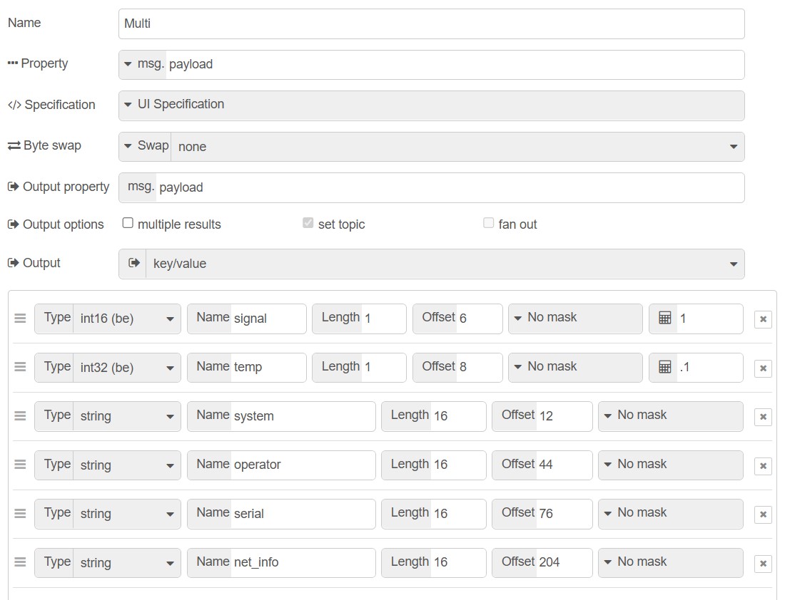 Modbus – egal ob über RS232/485 oder über TCP – funktioniert so, das man dem Server eine Anfrage schickt und ihm sagt, ab welcher Adresse man Daten haben möchte, und wieviele Register. Jedes Register entspricht 16 Bit, für eine 32Bit Zahl muß man also 2 Register lesen (Modbus Grundlagen (2014); WuT Modbus-TCP Hintergrundwissen ([kein Datum])). Für einen String dann halt so viele Register, wie der String Zeichen hat. Ein Modbus-Node in Node-Red gibt natürlich keine Zahlen oder Strings aus, sondern so viele einzelne Daten, wie man halt angefordert hat. Die muß man dann weiterverarbeiten. Maximal lassen sich 125 Register auf einmal lesen. Die Implementierung ist aber von Gerät zu Gerät unterschiedlich, und niemand garantiert einem dies. Wie wir sehen werden, stimmt das auch. Zum Auswerten der Daten gibt es das Paket node-red-contrib-buffer-parser. Man liest den interessierenden Registerbereich aus und konfiguriert im Node die Bereiche und die Datentypen: